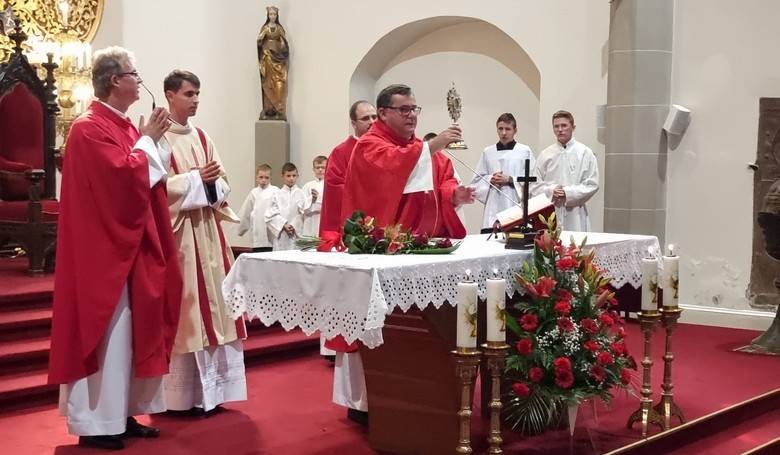 Hlavným celebrantom odpustovej svätej omše v Kežmarku bol Ivan Kňaze, ktorý na záver udelil všetkým požehnanie relikviou Svätého kríža. Snímka: Martin Sokáč