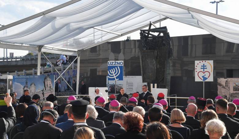 „Tu, v tejto slovenskej zemi - zemi stretnutí medzi východom a západom, severom a juhom, rodina synov Izraela nech naďalej rozvíja toto povolanie byť znakom požehnania pre všetky pokolenia zeme,“ povedal v príhovore Svätý Otec František. Snímka: profimedia.sk