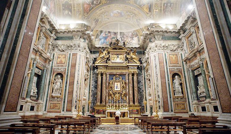 Pri milostivom obraze Presvätej Bohorodičky Salus populi romani v Bazilike Santa Maria Maggiore v centre Ríma 10. septembra pápež František prosil Božiu Matku o orodovanie u Božieho Syna za požehnanie pre svoju blížiacu sa zahraničnú cestu. Snímka: profimedia.sk