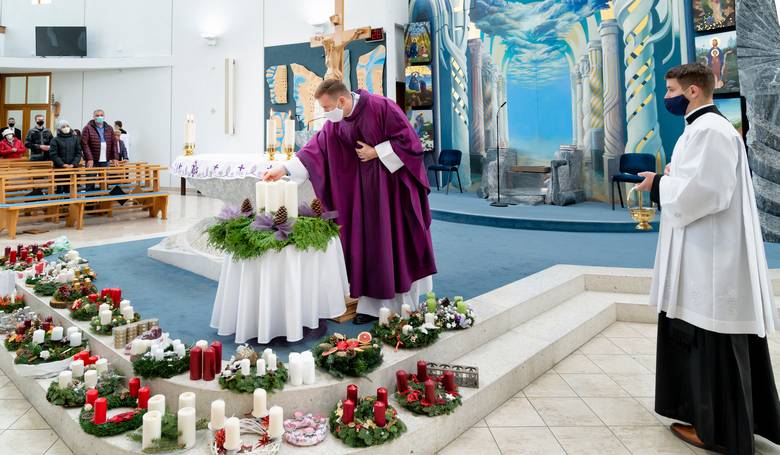 V ružinovskom Kostole sv. Vincenta de Paul v Bratislave adventné vence na svätej omši požehnal kaplán vo farnosti Bratislava-Prievoz Dominik Pavol, CM (na snímke).