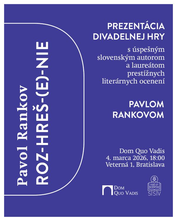 Spolok svätého Vojtecha a Dom Quo Vadis pozývajú na prezentáciu novej divadelnej hry Roz-hreš-(e)-nie od slovenského spisovateľa Pavla Rankova, ktorá sa uskutoční 4. marca o 18.00 hod. v Dome Quo Vadis v Bratislave.