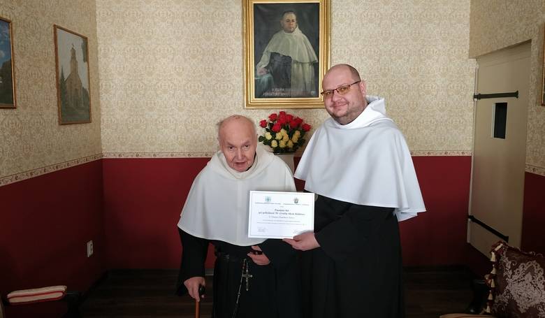 Viliama Františka Vaľu (vľavo) z Kongregácie bratov tešiteľov z Getseman pred 70 rokmi vyviezli z kláštora tešiteľov v Bratislave. Pri príležitosti tohto výročia dostal od Konfederácie politických väzňov Slovenska pamätný list. Páter Viliam Vaľa ho prijal z rúk generálneho predstaveného Kongregácie bratov tešiteľov z Getseman Michala Krysztofowicza. / Snímka: archív Kongregácie bratov tešiteľov
