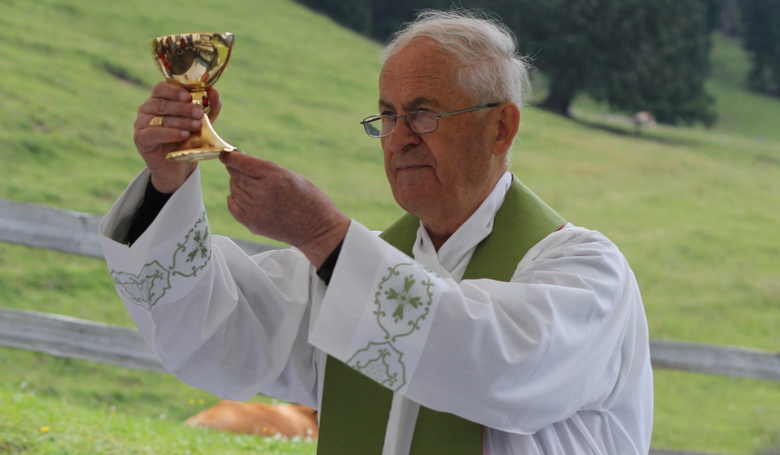 Kardinál Jozef Tomko počas slávenia svätej omše v jeho obľúbených talianskych Dolomitoch. Snímka: Marek Poláček