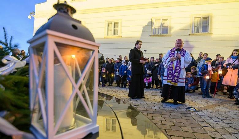 Biskup Viliam Judák sa prihovára veriacim na nádvorí Nitrianskeho hradu počas Prvej adventnej nedele. Snímka: Martin Havran