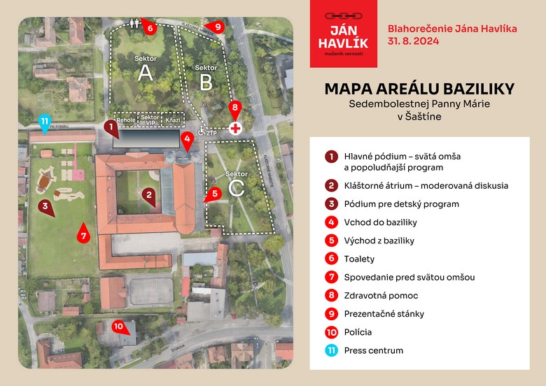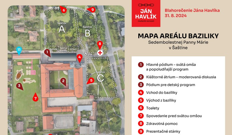 Zorientovať sa v priestore areálu pomôže aj mapa stiahnuteľná na oficiálnej stránke. Infografika: Organizačný tím blahorečenia