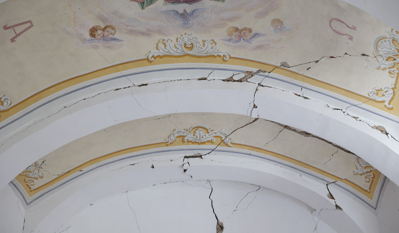 Detail poškodenia chrámu v Jankovciach. Snímka: Jaroslav Fabian