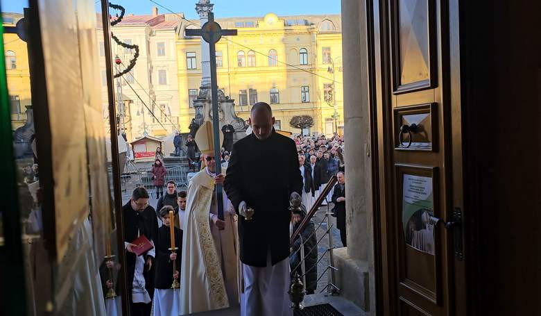 Banskobystrický biskup Marián Chovanec vstupuje s jubilejným krížom do Katedrály sv. Františka Xaverského počas otvorenia jubilejného roka. Snímka: Zuzana Szakácsová