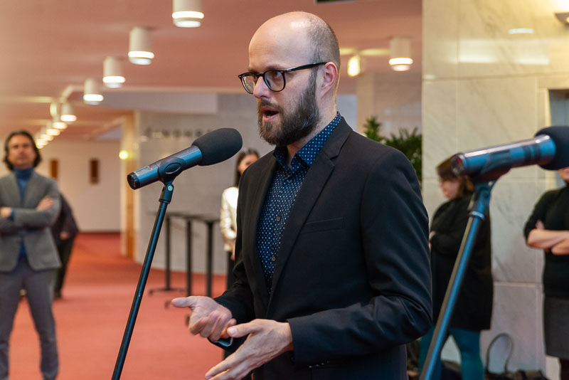 V úvodnom slove kurátor predstavil koncepciu výstavy, ktorá sa snaží mapovať jeho púť hereckou kariérou.