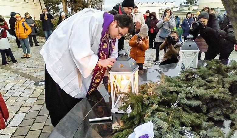 Na adventnom venci sa rozhorela prvá svieca. Na nádvorí Nitrianskeho hradu ju zapálil Miroslav Cimerák. Snímka: Tibor Ujlacký