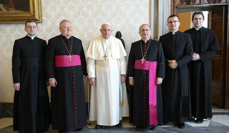Delegácia KBS sa 21. januára stretla s pápežom Františkom. Na snímke zľava: výkonný tajomník KBS Ivan Ružička, podpredseda KBS Viliam Judák, predseda KBS Bernard Bober, jeho osobný tajomník Jozef Kmec a tajomník nitrianskeho biskupa Miroslav Cimerák. Snímka: profimedia.sk