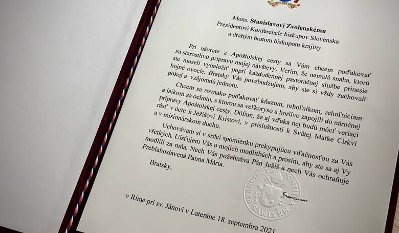 Pápež František sa poďakoval za prípravu návštevy na Slovensku. Urobil tak v liste, ktorý adresoval predsedovi Konferencie biskupov Slovenska (KBS) Stanislavovi Zvolenskému a ostatným biskupom.