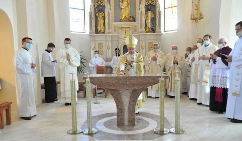 „Modlím sa za vás a za váš príspevok viery, ktorý ste tomuto svetu ukázali aj v podobe obnoveného chrámu. Nech vám svätá Katarína pomáha aj naďalej a Panna Mária nech na vás dáva pozor, aby ste boli vytrvalí na ceste za Kristom. Chcem osobitne vyzdvihnúť vašu obetavosť a štedrosť a ďakujem za vašu angažovanosť,“ uviedol v homílii arcibiskup Bober, ktorý v obnovenom chráme posvätil a pomazal nový oltár a štyri konsekračné kríže na stenách kostola.