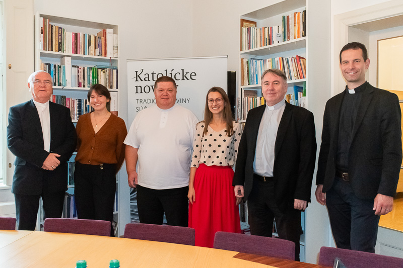 Na snímke zľava: žilinský biskup Tomáš Galis, redaktorka Barbora Kullačová, nitriansky pomocný biskup Peter Beňo, asistentka šéfredaktora KN Monika Takáčová, predseda SSV biskup Ján Kuboš a Patrik Taraj, tajomník diecézneho administrátora Spišskej diecézy. Snímka: Erika Litváková