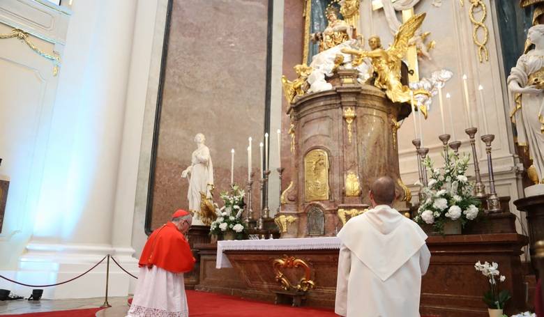Kardinál Petro Parolin v modlitbe pri milostivej soche Sedembolestnej Panny Márie v šaštínskej bazilike. Snímka: -TK KBS-/Peter Zimen