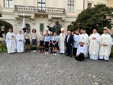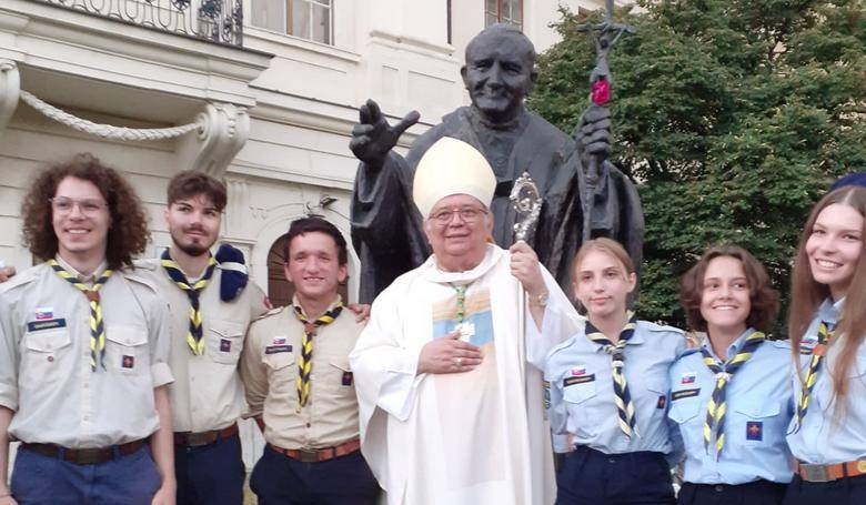 Trnavský arcibiskup Ján Orosch so skautmi pri soche sv. Jána Pavla II. Snímka: Jozef Machovič