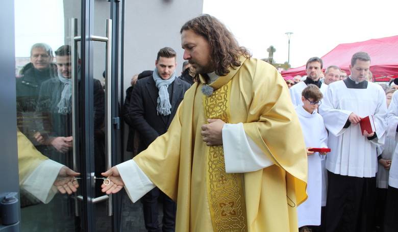 Farár Gabriel Klenko po obrade odovzdania kľúčov slávnostne odomkol nový kostol. Snímka: Monika Šimoničová