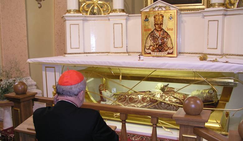 Na snímke z roku 2006 sa kardinál Stanisław Dziwisz modlí pri relikviách bl. Vasiľa Hopka. Snímka: -TK KBS-/Ľubomír Petrík