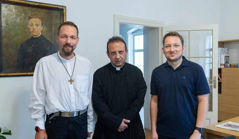 Redakciu Katolíckych novín navštívil 25. júla melchitský katolícky kňaz Simon Khoury (na snímke v strede) pôsobiaci v Káne Galilejskej. Sprevádzal ho slovenský salezián Marián Drahoš, ktorý sa s otcom Simonom zoznámil pred pár rokmi v Izraeli.