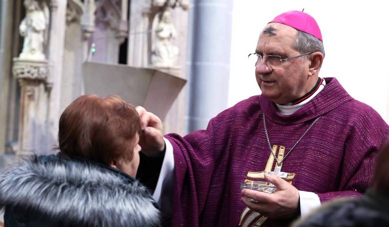 Košický arcibiskup metropolita Bernard Bober udelil veriacim znak popola v Katedrále sv. Alžbety v Košiciach. Snímka: Jaroslav Fabian