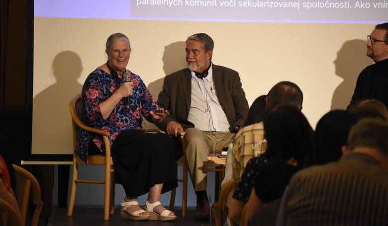 Kimberly a Scott Hahnovci počas diskusie s publikom po prednáškach v Pálffyho paláci v Bratislave. Snímka: Zuzana Artimová