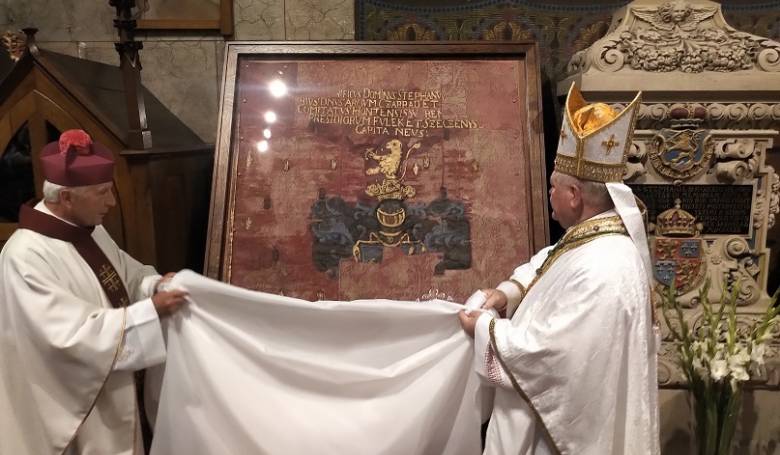 Nitriansky biskup Viliam Judák (vpravo) s rektorom baziliky Petrom Brodekom odhalili zreštaurovanú bojovú zástavu obrancu bývalej Tekovskej župy a kresťanstva Štefana Koháryho. Snímka: ARCHÍV NITRIANSKEHO BISKUPSTVA