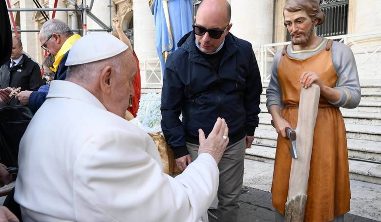 Svätého Otca prišli pozdraviť nadšení veriaci z farnosti svätého Jozefa, robotníka, v talianskom mestečku Pisticci. Sprevádzal ich don Giuseppe Di Tolve. Pápež požehnal sochu ich miestneho patróna i celú obec. Snímka: profimedia.sk