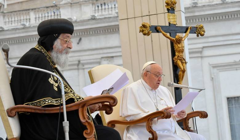 Pred pódiom sa Svätý Otec František zvítal s patriarchom Tawadrosom II., ktorý zaujal miesto po jeho pravici. Spolu si pripomenuli 50. výročie stretnutia Pavla VI. a Šenudu III. Išlo o prvé stretnutie rímskeho biskupa a patriarchu Koptskej pravoslávnej cirkvi.
