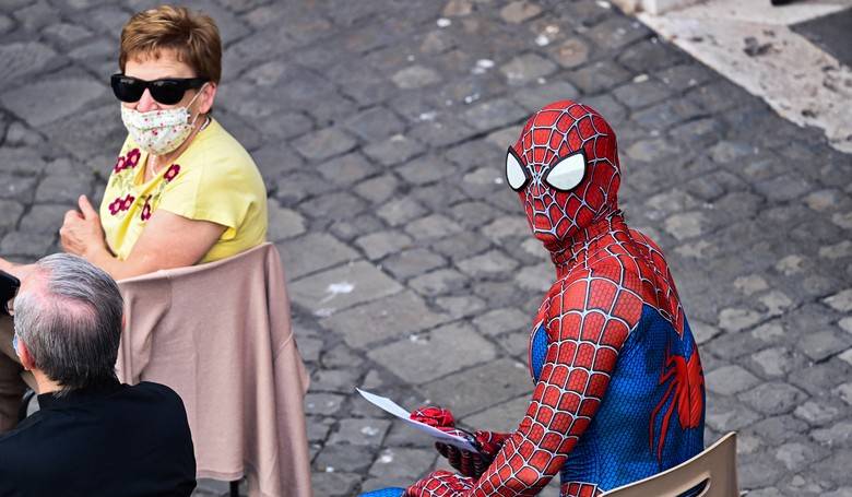 Na generálnej audiencii bol aj dobrovoľník Mattia Villardita, ktorý v prezlečení za komiksového hrdinu chodí do nemocníc medzi hospitalizované deti. Snímka: profimedia.sk