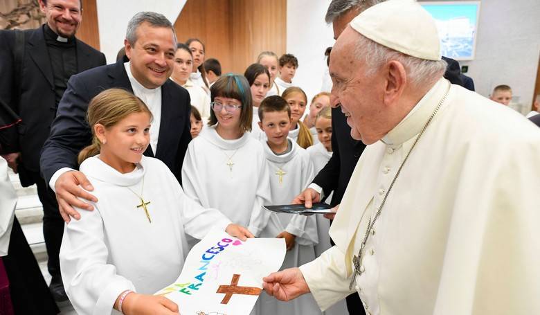 Svätého Otca prišli pozdraviť viaceré skupiny detí, ktoré ho obdarovali svojimi obrázkami. Snímka: profimedia.sk
