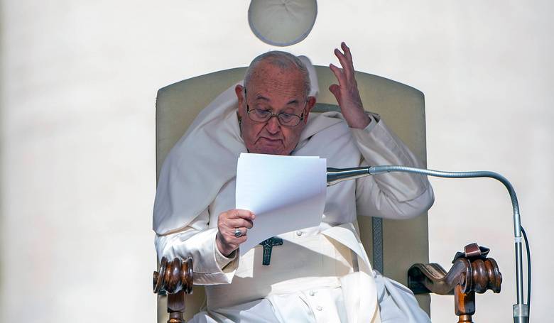Silný vietor, ktorý dul na vatikánskom námestí, potrápil aj Svätého Otca. Pousmial sa a pokračoval v katechéze. Snímka: profimedia.sk