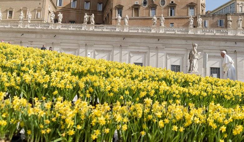 Priestranstvo pred Bazilikou sv. Petra rozkvitlo tisícami narcisov, ktoré darovali Vatikánu holandskí kvetinári. Snímka: profimedia.sk