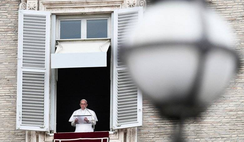 Svätý Otec František v okne apoštolského paláca vo Vatikáne počas príhovoru pred modlitbou Anjel Pána. Snímka: profimedia.sk