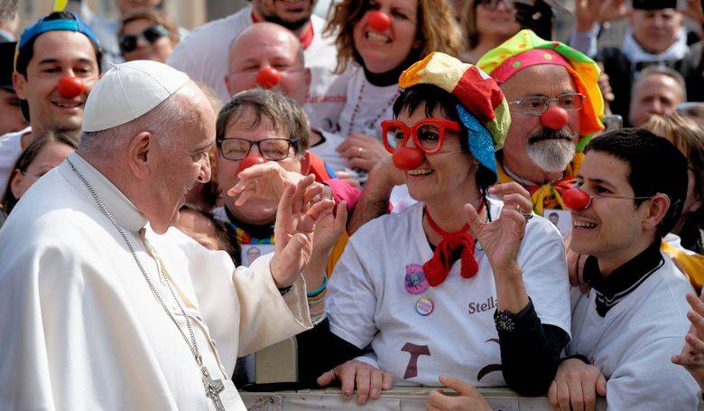Členovia klaunskej terapeutickej skupiny Francesclaun prišli na audienciu Svätému Otcovi ukázať, s akou radosťou slúžia deťom, chorým, starým či opusteným a prinášajú im účinný liek úsmevu. Snímka: profimedia.sk
