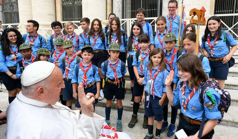 Svätý Otec sa pozdravil so skautmi z Viterba skautským pozdravom – palec, o ktorý sa opiera malíček, symbolizuje, že silnejší vždy chráni slabšieho. Snímka: profimedia.sk