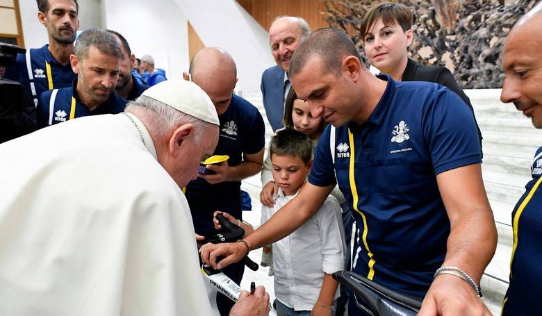 Na audiencii boli aj cyklisti Athletica Vaticana, ktorí s pápežom nakrátko hovorili o „SDM športu“. Svätý Otec podpísal bicykel, ktorý pôjde do dražby na podporu pediatrickej ambulancie Santa Marta v prospech chudobných rodín s deťmi. Snímka: profimedia.sk