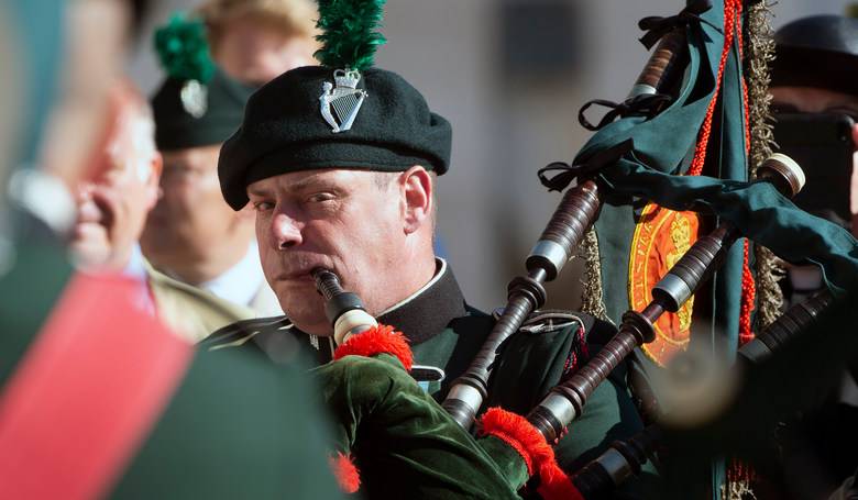 Príchod Svätého Otca na audienciu sprevádzali gajdové tóny kapely The Royal Irish Regiment, ktorú sprevádzal britský veľvyslanec pri Svätej stolici Chris Trott. Kapela pluku hrala pred pápežom Františkom na Námestí sv. Petra pri príležitosti 80. výročia oslobodenia Ríma. Snímka: profimedia.sk