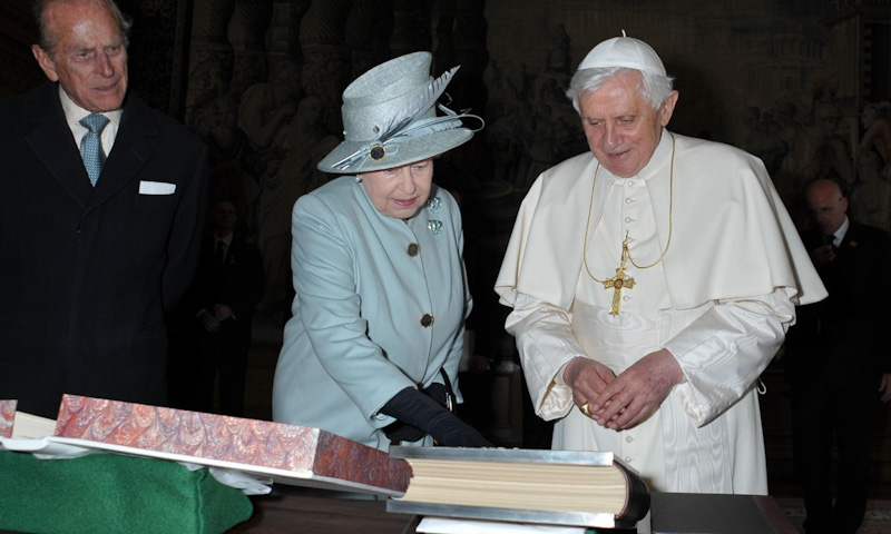 „Som potešená, že vaša návšteva ponúka príležitosť prehĺbiť vzťahy medzi Rímskokatolíckou a Anglikánskou cirkvou,“ povedala vtedy kráľovná. V príhovore spomínala na svoje návštevy Vatikánu a stretnutia s predchodcami Benedikta XVI.