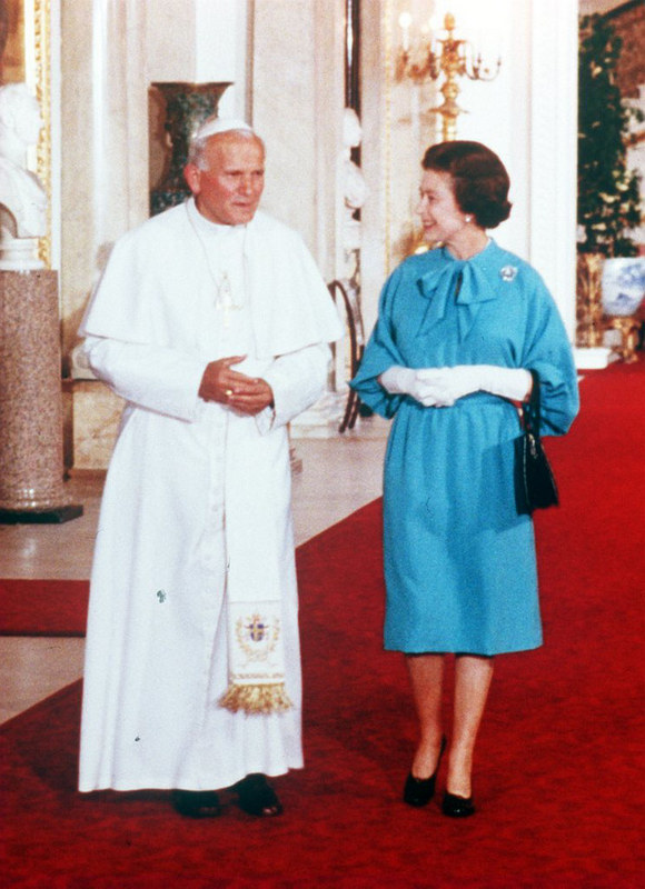 S Jánom Pavlom II. sa stretla trikrát. Najskôr 17. októbra 1980, keď Alžbeta II. prišla s princom Philipom do Vatikánu. O dva roky neskôr sa pápež vydal na pastoračnú návštevu do Veľkej Británie. S kráľovnou sa zišiel 28. mája 1982 v Buckinghamskom paláci.