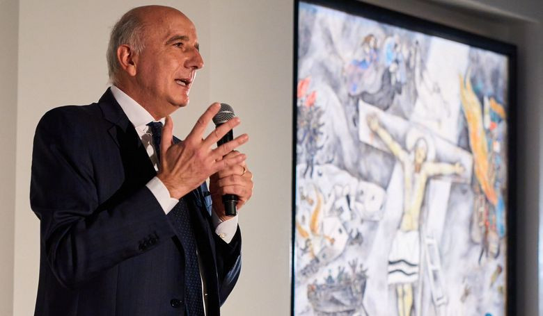 Biele ukrižovanie od Marca Chagalla v Paláci Cipolla predstavil Franco Parasassi, prezident charitatívnej organizácie Fondazione Roma. Snímka: facebook.com/ Museo del Corso