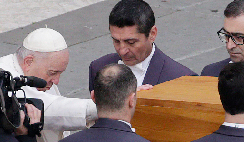 Svätý Otec František si telesné pozostatky Benedikta XVI. v rakve uctil aj prežehnaním, poklonou a modlitbou. Snímka: profimedia.sk