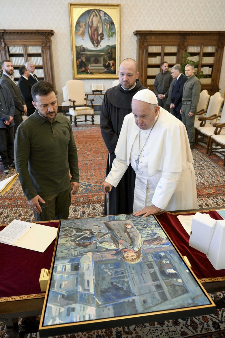 Ako je zvykom, obaja lídri si vymenili dary a pápež sa pozdravil s delegáciou sprevádzajúcou prezidenta Zelenského. Ukrajinský prezident daroval pápežovi Františkovi olejomaľbu s názvom Masaker v Buči. Príbeh Maričky.