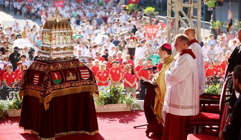 Oltáru dominovala relikvia pravice sv. Štefana, kráľa. Súčasťou slávnosti bola aj procesia s relikviou ulicami centra Budapešti. Snímka: facebook.com/ Ostrihomsko-budapeštianska arcidiecéza