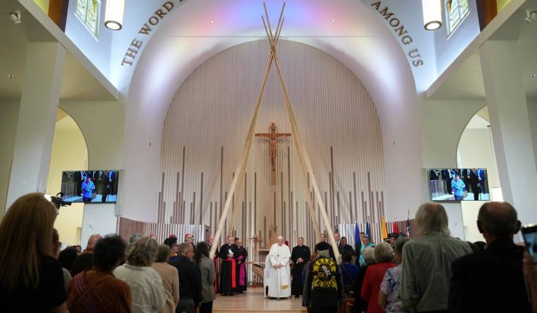 Pápež sa stretol v západnom meste Edmonton s farníkmi z Kostola Najsvätejšieho Srdca prvých národov, čo bolo v nadväznosti na jeho verejné ospravedlnenie za úlohu Cirkvi pri prevádzkovaní internátnych škôl.