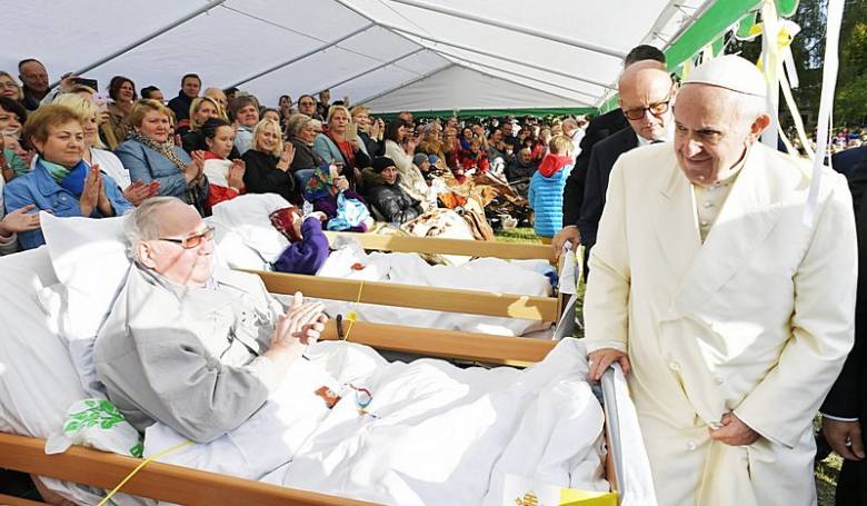 Pápež František nevynechal príležitosť stretnúť sa s chorými ani vo Vilniuse. Snímka: profimedia.sk