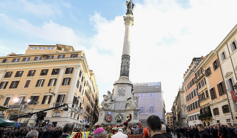 Pápež ako zvyčajne položil k podstavcu stĺpa Immaculaty kyticu bielych ruží a prosil Pannu Máriu, aby pomáhala všetkým ľuďom v ich utrpení a zápasoch. Osobitne prosil za mier pre svet a Ukrajinu.
