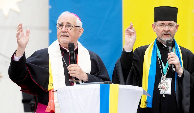 Biskup Diecézy Rottenburg-Stuttgart Gebhard Fürst (vľavo) a ukrajinský biskup Bohdan Dzjurach sa zúčastnili na podujatí Solidarita s Ukrajincami, ktoré sa konalo v rámci nemeckých Katolíckych dní. Snímka: profimedia.sk