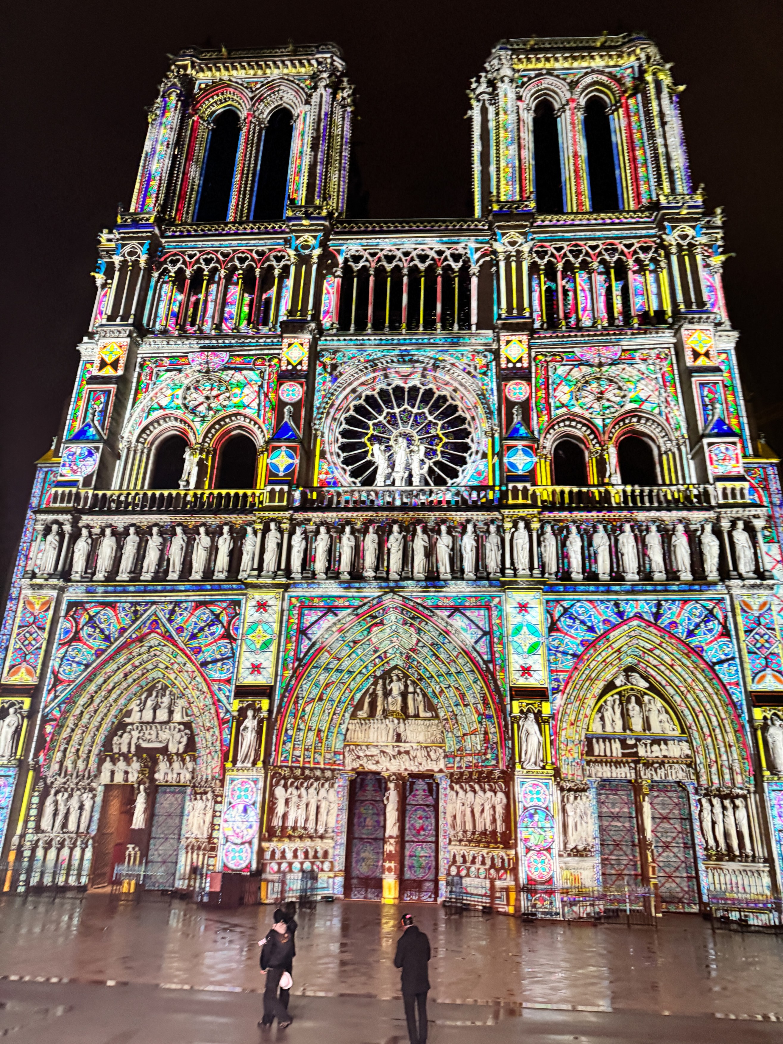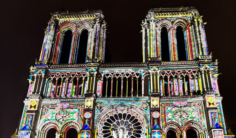 Fasáda vstupného portálu Katedrály Notre-Dame počas svetelnej projekcie 7. decembra večer po znovuotvorení. Snímka: profimedia.sk
