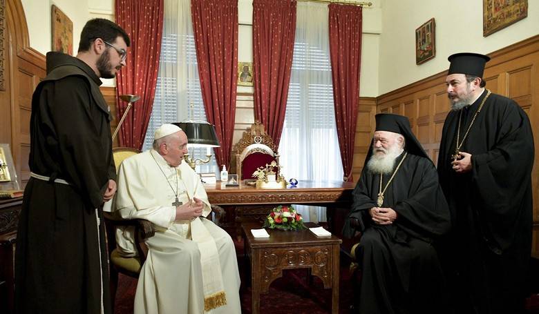 Popoludňajší program prvého dňa apoštolskej cesty pápeža Františka v Grécku sa 4. decembra začal zdvorilostnou návštevou Svätého Otca u hlavy Gréckej pravoslávnej cirkvi Hieronyma II. Pri stretnutí obnovil prosbu o odpustenie chýb katolíkov z minulosti a vyjadril úprimnú túžbu po jednote.