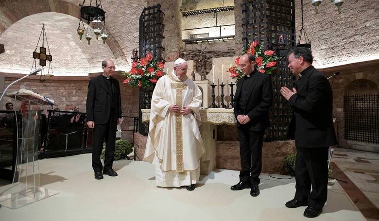 Spolu s miestnym biskupom Domenicom Sorrentinom a kardinálom Agostinom Vallinim, ktorý je pápežským legátom pre baziliky sv. Františka a Panny Márie Anjelskej v Assisi, sa na svätej omši zúčastnilo aj niekoľko rehoľných sestier.