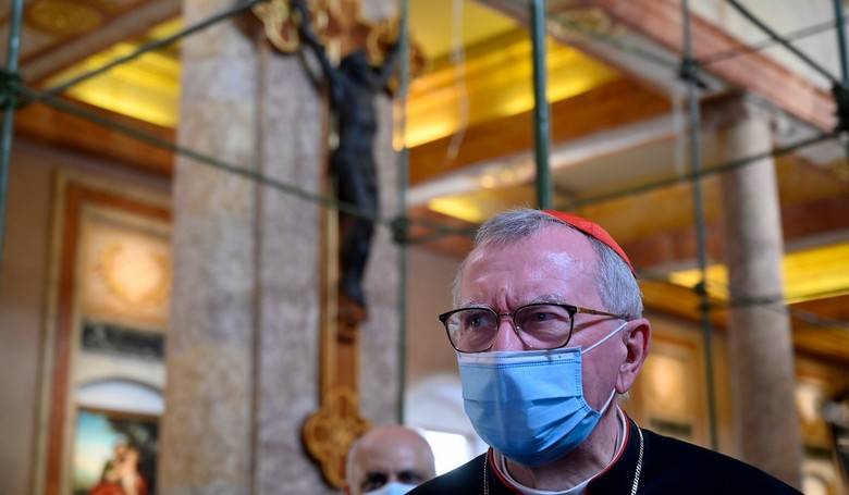 Vatikánsky štátny sekretár Pietro Parolin v bejrútskej Katedrále sv. Juraja, poškodenej explóziou zo 4. augusta 2020. Snímka: profimedia.sk